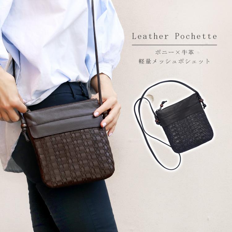 日本製 レザー メッシュ ポシェット 本革 ショルダーバッグ 牛革 馬革 ポニー 斜め掛け 軽量 TB1384