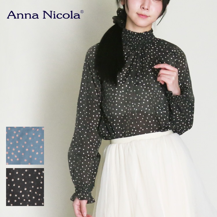 ドット柄 ブラウス シアー モックネック カットソー 長袖 レディース かわいい Anna Nicola