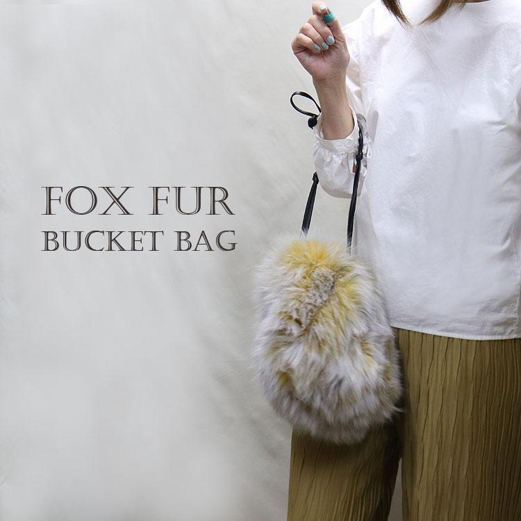 フォックス ファー バケットバッグ 巾着 ショルダー イエローグレー トートバッグ レディース