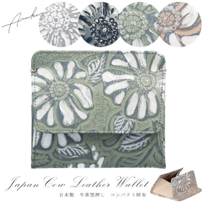 日本製 本革 手染め 型押し コンパクト財布 アニス