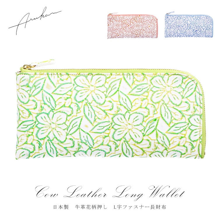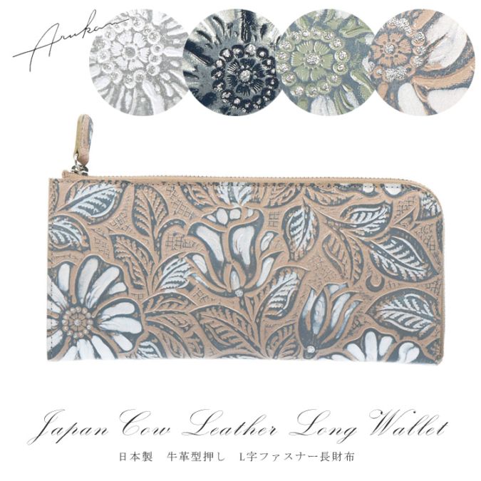 財布 日本製 本革 花柄 型押し 手塗り L字ファスナー 長財布 ペタリー