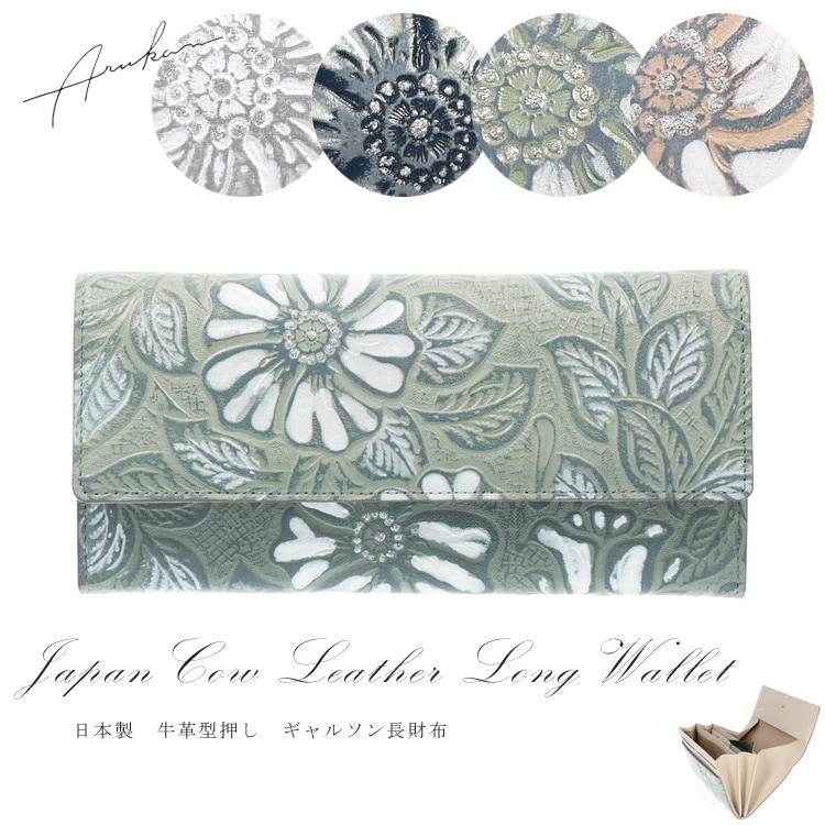 Arukan アルカン Neutral Gray Nippon 本革 財布 イタリア製牛革 エンボス ギャルソン 長財布 かぶせ サイフ デイジー ひな菊 メタリック NP061