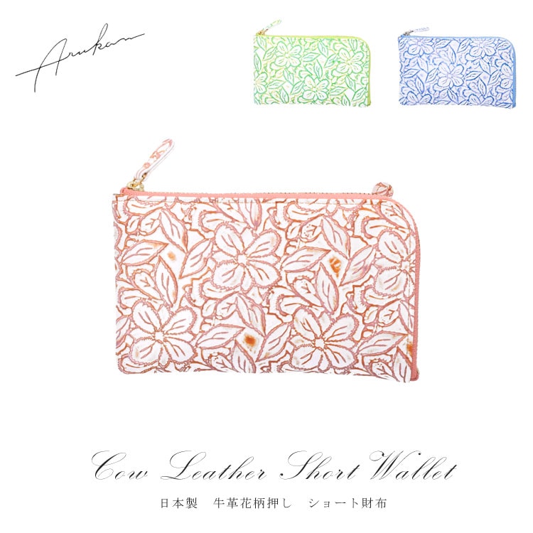 財布 日本製 本革 花柄 型押し 手塗り ショート L字ファスナー財布 ペタリー