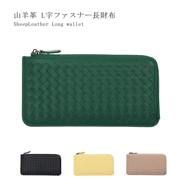 羊革 長財布 シープレザー L字ファスナー メッシュ 編み込み 本革 薄型
