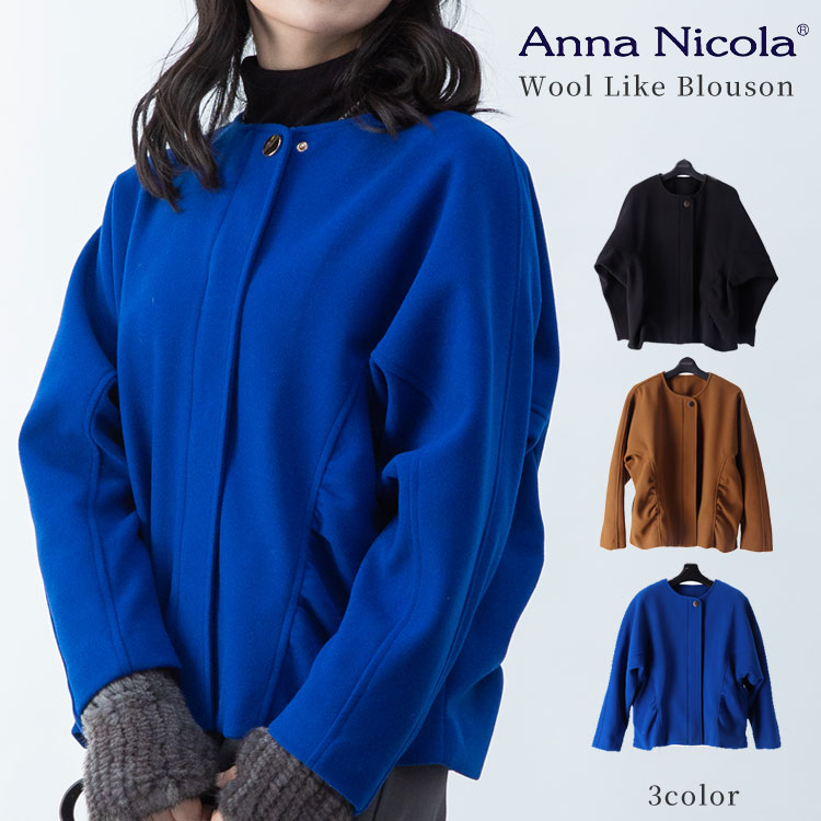 ブルゾン レディース ジャケット フェイクウール Anna Nicola アンナニコラ ノーカラー ショート丈 コート ウールライク PM-704701F3 38 ブラック ブラウン ブルー